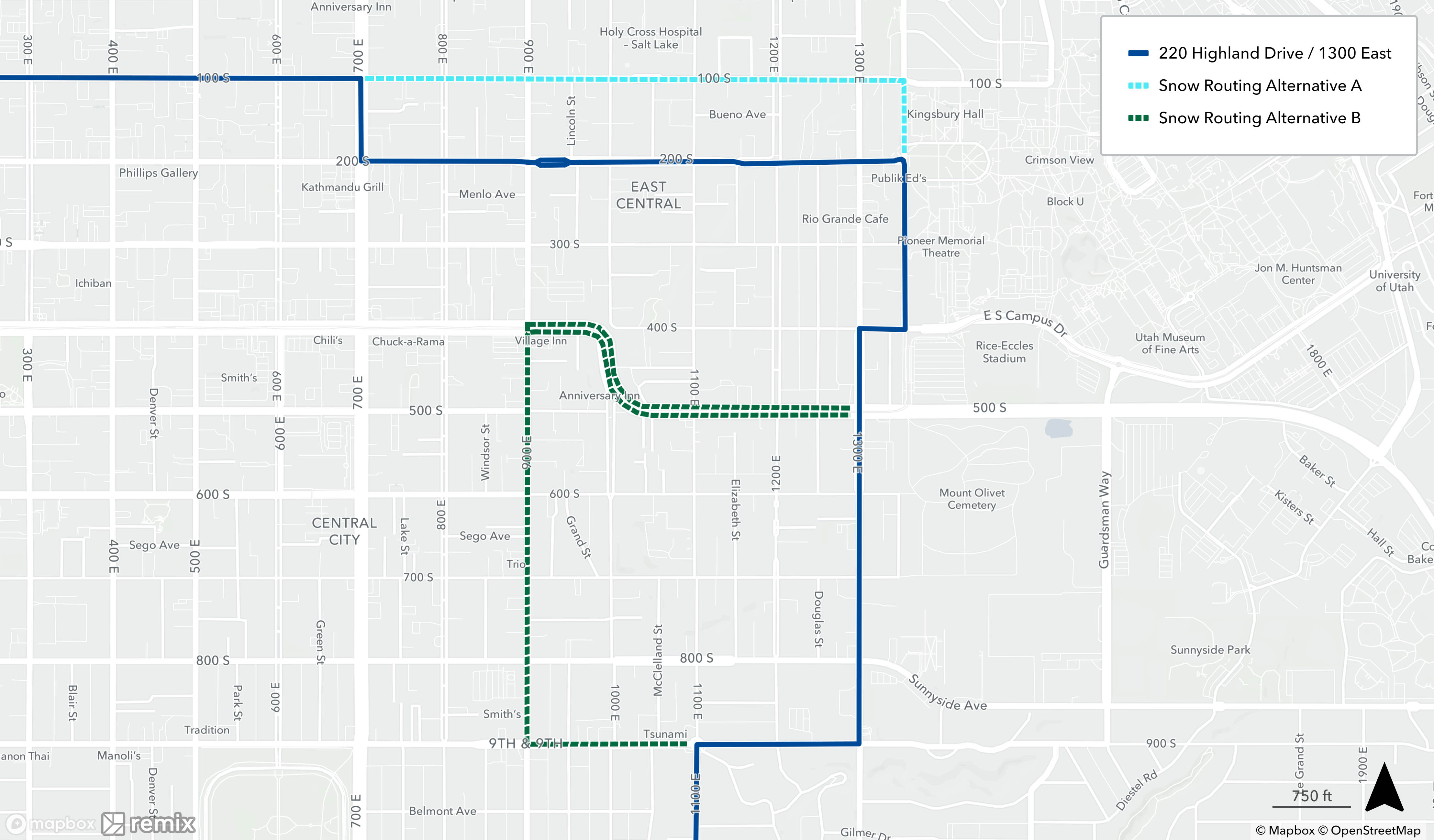 Snow routing occurs when UTA buses are unable to follow their regular route due to inclement weather. If there is a substantial amount of snow or ice on the roads, buses will avoid steep hills in favor of safer routes. Snow routing only affects select UTA bus routes and stops and is only put into place during or immediately after severe weather. Once roads are cleared, buses will resume their regular routes.